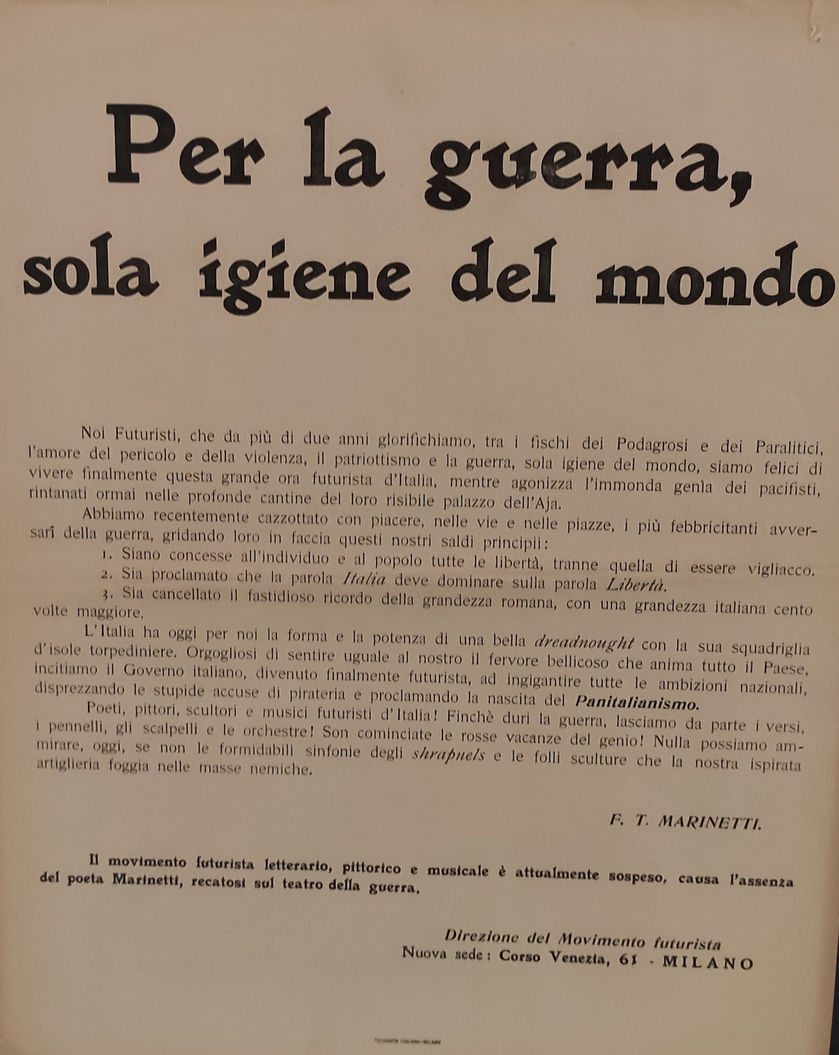 dans le Manifeste du futurisme de 1909. En effet, l’appel à la destruction des vestiges du passé fait scandale à l’époque de la publication du texte, ce qui laisse passer presque pour inaperçu l’article 9 (G. Lista, 2001) : « Nous voulons glorifier la guerre – seule hygiène du monde –, le militarisme, le patriotisme, le geste destructeur des anarchistes […] ». Marinetti voit dans la guerre un remède contre ce qu’il considère comme « l’agonie » de la nation italienne, considérant qu’un peuple qui n’a pas de vertus militaires ne peut pas réellement avoir de conscience nationale. De plus, mise en rapport avec les notions de dynamisme et d’énergie défendues dans ce même texte, la violence de la guerre apparaît comme un nouveau départ pour la nation italienne encore en manque d’unité. Par cette idée de primauté de la nation et de la guerre, Marinetti se rapproche du Parti national italien en mai 1914 avec lequel il ne partage cependant aucune autre idée. Cette conception ne fut que peu très peu partagée par les autres futuristes.