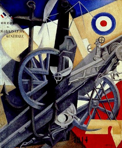 Au lieu de décrire, Severini juxtapose textes et symboles sous forme de collage cubiste : il associe l’ordre de mobilisation, une ancre, des pièces artilleries, un avion arborant la cocarde tricolore ainsi qu’une cheminée d’usine. Outre le fait qu’il n’y ait aucune présence humaine, cette union entre la modernité industrielle et modernité artistique apparaît de manière évidente.