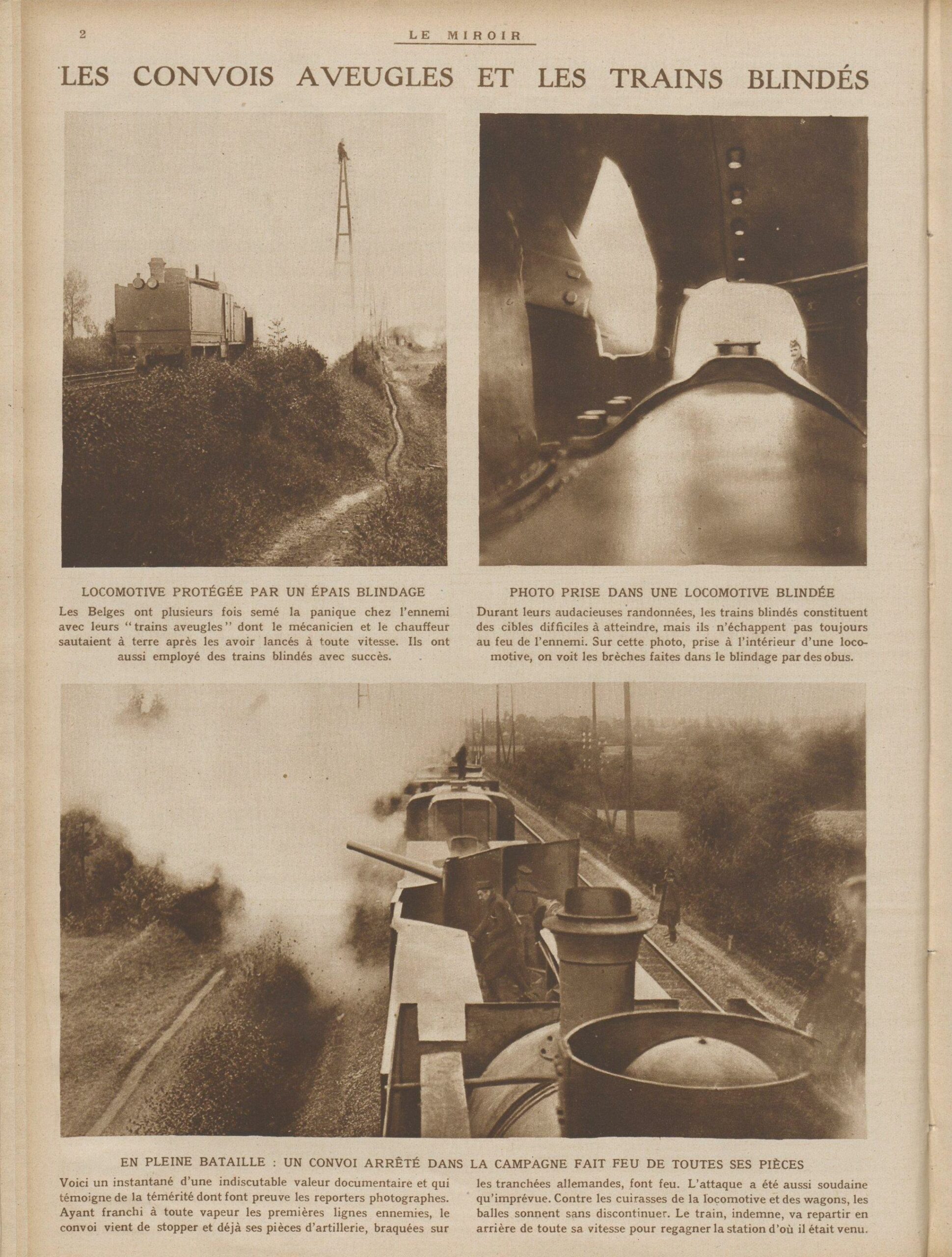 Par ailleurs, le Train blindé en action (1915) met également l’accent sur la puissance mécanique et la violence guerrière. Cette toile s’inspire d’une série de photographies publiées dans Le Miroir, le 1er novembre 1914, où un train blindé belge, ici équipé de tourelles, aurait fait feu sur les tranchées allemandes de première ligne. On trouve aussi, sur Gallica, une photographie prise par l’Agence Rol, également en novembre 1914. L’œil se focalise dans cette œuvre sur la masse ainsi que sur la puissance de feu de la tourelle, le rôle des soldats semblant ici dérisoire à côté de la machine.