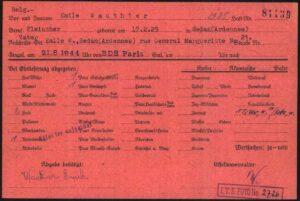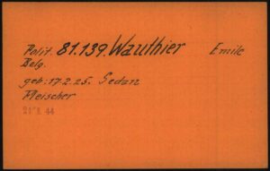 D’après la fiche d’inventaire de Mimile, il avait très peu de vêtements avec lui, seulement une montre (Uhr) et une chaîne (Kette). Le petit « w » veut peut-être dire Wert, signifiant que l’objet avait une certaine valeur. C’est une hypothèse de Bernard Langlais, que je remercie amicalement pour son aide à la compréhension de ces documents. Détail intéressant : Mimile est enregistré comme prisonnier politique belge par le BdS de Paris (Befehlshaber der Sicherheitspolizei und des Sicherheitsdienstes), autrement dit l’administration centrale de la Gestapo en France. Cela signifie que soit sa naturalisation, qui eut lieu à ses 20 ans en 1943, n’a pas été officialisée durant la guerre, soit Mimile s’est lui-même présenté comme Belge. Il me semble que, d’après ce que me disait mon père, Serge et Mimile n’avaient aucun papier sur eux. Ils les auraient laissés sur des corps, se faisant passer pour mort à Lussac. La profession de Mimile était, selon la traduction « boucher » ou « charcutier ». Après le Débarquement en Normandie, le chef de la BdS de Paris, Helmut Knochen, indique que, du fait de l’avancée des Alliés, il a été décidé d’envoyer en Allemagne les prisonniers politiques encore détenus en France. C’est en raison de ce contexte que le convoi n°79 servit à emmener majoritairement des résistants français.
