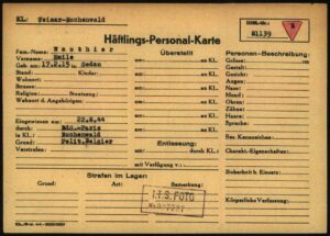 Mimile et Serge arrivent à Buchenwald le 21 août, après être passés par Erfurt et Weimar. Cette date apparaît avec le tampon dateur visible sur la fiche de déporté de Mimile. Ce dernier porte le matricule n°81139, Serge, le n°81140. En 2022, j’ai découvert l’existence des Archives Arolsen, un centre de documentation, d’information et de recherche sur la persécution national-socialiste, le travail forcé et la Shoah. On y trouve de précieuses informations enregistrant l’arrivée de Mimile, avec, notamment, sa signature sur la première fiche numérisée :