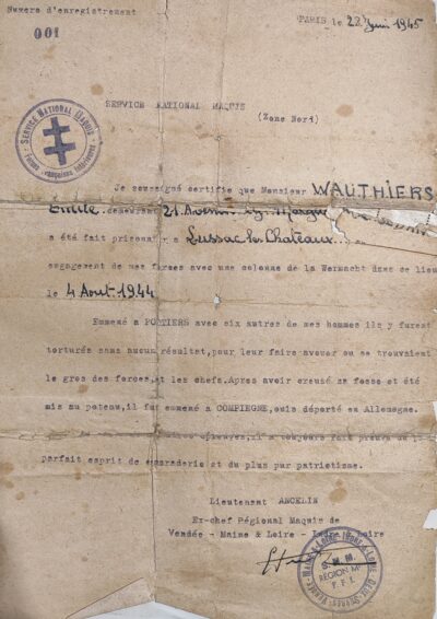 Dans le dossier de résistant d’Émile Wauthier conservé par le SHD (GP 16P 601421), la même citation est reprise plusieurs fois. Celle-ci provient d’une déclaration signée d’Ancelin. Mimile est fait mention d’un « jeune soldat placé en avant poste au pont de Lussac-les-Châteaux, a eu au cours de l’attaque du 4.8.44 une tenue parfaite. Volontaire pour évacuer un camarade mortellement blessé, a accompli sa mission avec succès, circulant pendant plusieurs heures sur des routes dont nous n’avions plus le contrôle, sous nos couleurs et sans armement, a fait preuve d’un réel courage d’une discipline et d’une abnégation totales. Fait prisonnier a su malgré les tortures garder un strict silence. Condamné à mort, mis au poteau, a été gracié au dernier moment, après avoir creusé sa fosse. Selon certains documents, à propos de cette bataille de Lussac, le dossier d’après guerre fait état d’une criante infériorité numérique : à 7 (groupement Le Chouan) contre 6000 (soldats de la Wehrmacht). Mimile a ensuite été torturé dans la prison de la Pierre Levée, à Poitiers, avec d’autres camarades, où il est resté 4 jours. Ces jours furent longs, Mimile indique avoir subi le supplice de la baignoire, avoir été grillé, frappé, puis emmené dans un camion le 7 août au matin. C’est à ce moment qu’il a creusé sa fosse et mis au poteau. Après avoir été gracié, il fut emmené à Compiègne, où il resta 8 jours.
