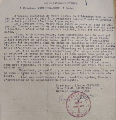 Le 2 octobre, le Capitaine Lucien, chef du Service social militaire F.F.I., écrit au « Chouan » pour signaler que, après lecture du rapport du 26 septembre, il a été fait mention que les corps des deux volontaires avaient été retrouvés « affreusement mutilés et inhumé à Chauvigny ». Le Capitaine Lucien précise que les parents de Mimile se sont rendus dans cette localité, mais n’ont pas trouvé le corps de leur fils ni celui de Serge. C’est en lisant ces courriers que j’imagine la détresse dans laquelle devaient se trouver mes arrière-grands-parents ! Une réponse à cette demande du 2 octobre fut formulée le 31 du même mois, émanant du lieutenant Pierre Glévarec, adjoint du « Chouan ». Au sujet des volontaires Wauthier et Roger, il délivre les éléments suivants :