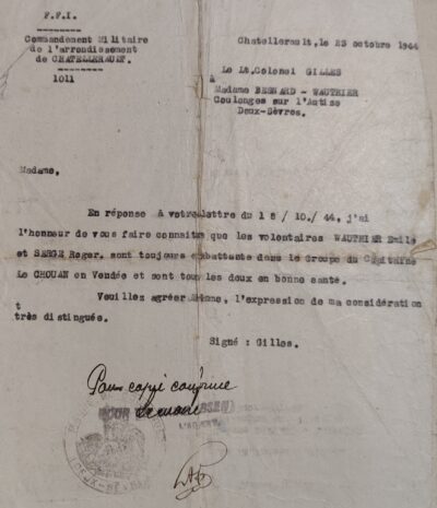 Or depuis cette date nous n’avons jamais eu de leurs nouvelles. Nous les avons donc considérés comme prisonniers des « boches » et comme nous le savons torturés et fusillés par ces bandits. Donc aujourd’hui la famille d’Émile Wauthier m’écrit pour en avoir des nouvelles. Je ne sais donc pas quoi leur répondre de bien affirmatif, craignant de dire des blagues, en plus ils ont écrit au commandant Gilles qui leur répond le texte suivant : « nous vous informons que Roger Serge et Émile Wauthier sont toujours au groupe « Le Chouan » en Vendée et sont en bonne santé ». Et pourtant, mon capitaine, depuis Lussac jusqu’au 23 septembre, date où je vous ai quitté à Coussay, nous ne les avons jamais revu. Souhaitant de tout cœur qu’ils reviennent avec nous […] ». Mimile est le neveu de Monsieur et Madame Besnard, également réfugié à Coulonges.