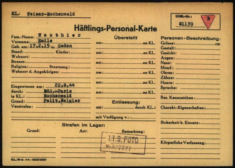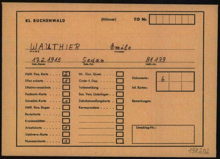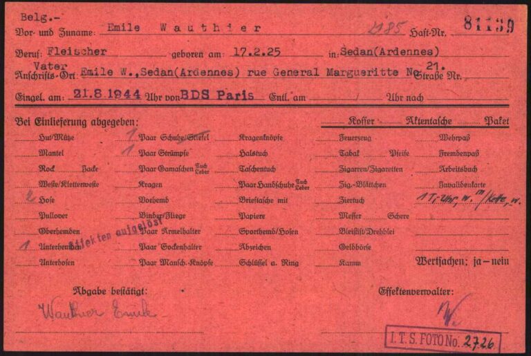D’après la fiche d’inventaire de Mimile, il avait très peu de vêtements avec lui, seulement une montre (Uhr) et une chaîne (Kette). Le petit « w » veut peut-être dire Wert, signifiant que l’objet avait une certaine valeur. C’est une hypothèse de Bernard Langlais, que je remercie amicalement pour son aide à la compréhension de ces documents. Détail intéressant : Mimile est enregistré comme prisonnier politique belge par le BdS de Paris (Befehlshaber der Sicherheitspolizei und des Sicherheitsdienstes), autrement dit l’administration centrale de la Gestapo en France. Cela signifie que soit sa naturalisation, qui eut lieu à ses 20 ans en 1943, n’a pas été officialisée durant la guerre, soit Mimile s’est lui-même présenté comme Belge. Il me semble que, d’après ce que me disait mon père, Serge et Mimile n’avaient aucun papier sur eux. Ils les auraient laissés sur des corps, se faisant passer pour mort à Lussac. La profession de Mimile était, selon la traduction « boucher » ou « charcutier ». Après le Débarquement en Normandie, le chef de la BdS de Paris, Helmut Knochen, indique que, du fait de l’avancée des Alliés, il a été décidé d’envoyer en Allemagne les prisonniers politiques encore détenus en France. C’est en raison de ce contexte que le convoi n°79 servit à emmener majoritairement des résistants français.