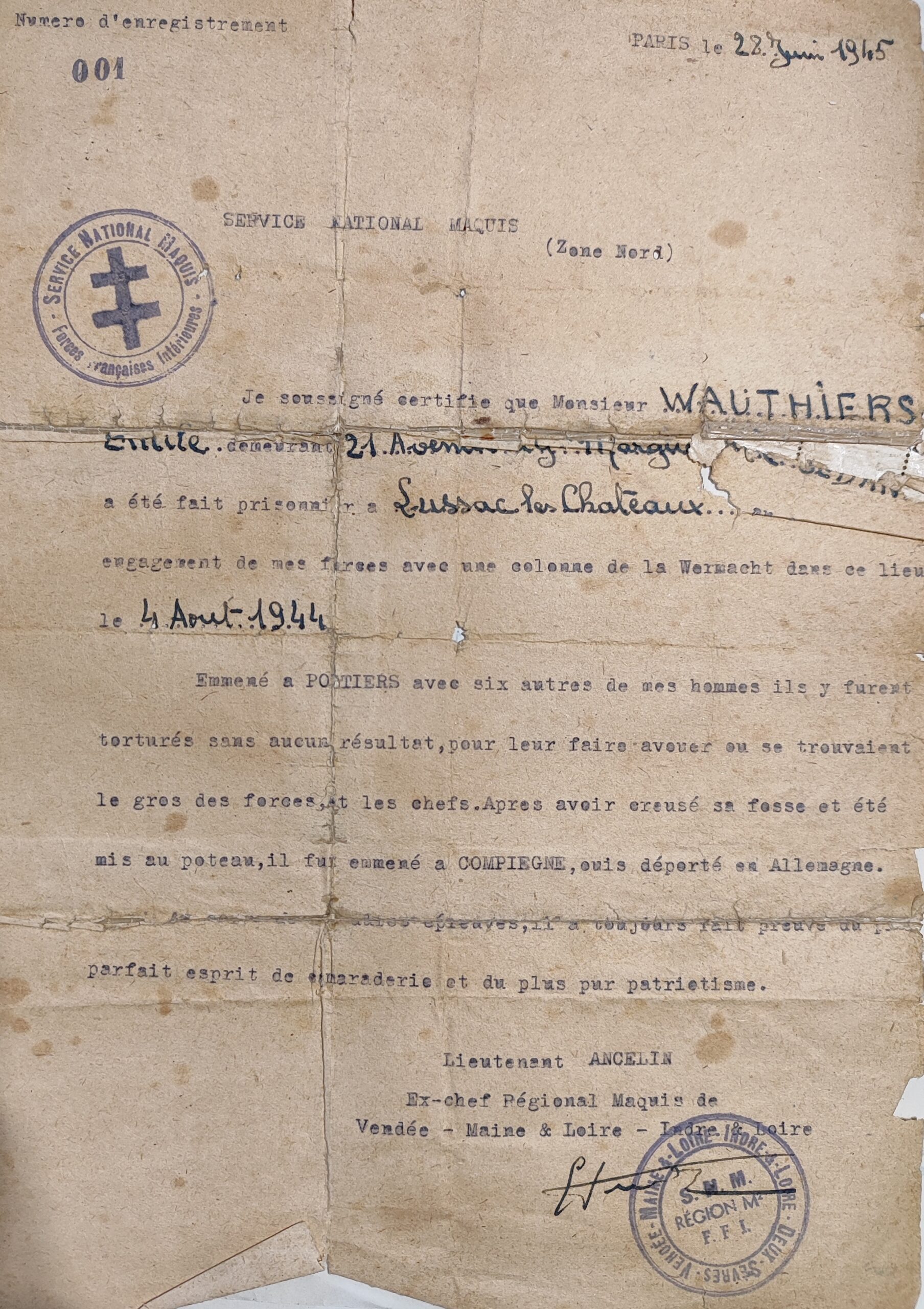 Dans le dossier de résistant d’Émile Wauthier conservé par le SHD (GP 16P 601421), la même citation est reprise plusieurs fois. Celle-ci provient d’une déclaration signée d’Ancelin. Mimile est fait mention d’un « jeune soldat placé en avant poste au pont de Lussac-les-Châteaux, a eu au cours de l’attaque du 4.8.44 une tenue parfaite. Volontaire pour évacuer un camarade mortellement blessé, a accompli sa mission avec succès, circulant pendant plusieurs heures sur des routes dont nous n’avions plus le contrôle, sous nos couleurs et sans armement, a fait preuve d’un réel courage d’une discipline et d’une abnégation totales. Fait prisonnier a su malgré les tortures garder un strict silence. Condamné à mort, mis au poteau, a été gracié au dernier moment, après avoir creusé sa fosse. Selon certains documents, à propos de cette bataille de Lussac, le dossier d’après guerre fait état d’une criante infériorité numérique : à 7 (groupement Le Chouan) contre 6000 (soldats de la Wehrmacht). Mimile a ensuite été torturé dans la prison de la Pierre Levée, à Poitiers, avec d’autres camarades, où il est resté 4 jours. Ces jours furent longs, Mimile indique avoir subi le supplice de la baignoire, avoir été grillé, frappé, puis emmené dans un camion le 7 août au matin. C’est à ce moment qu’il a creusé sa fosse et mis au poteau. Après avoir été gracié, il fut emmené à Compiègne, où il resta 8 jours.