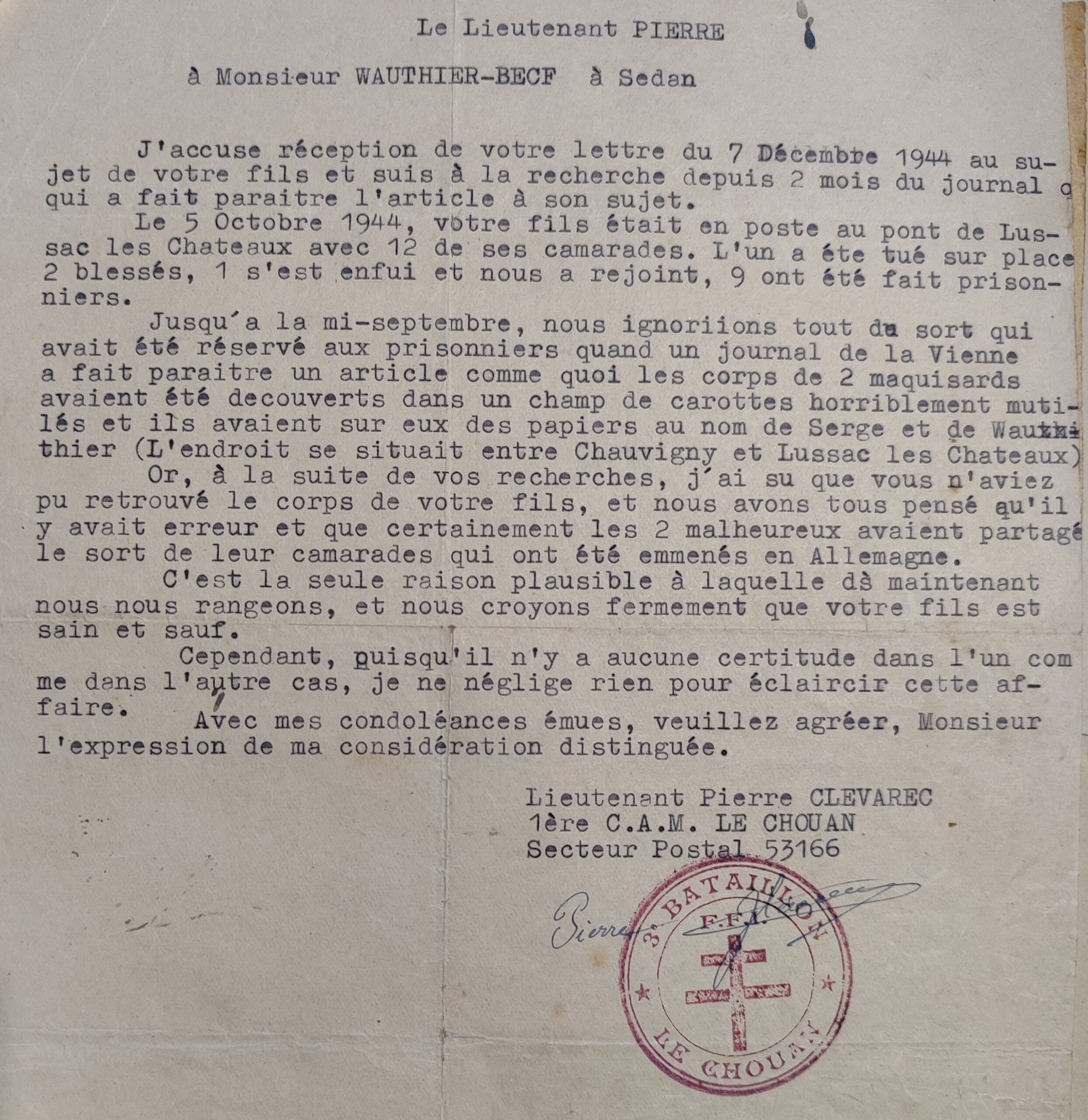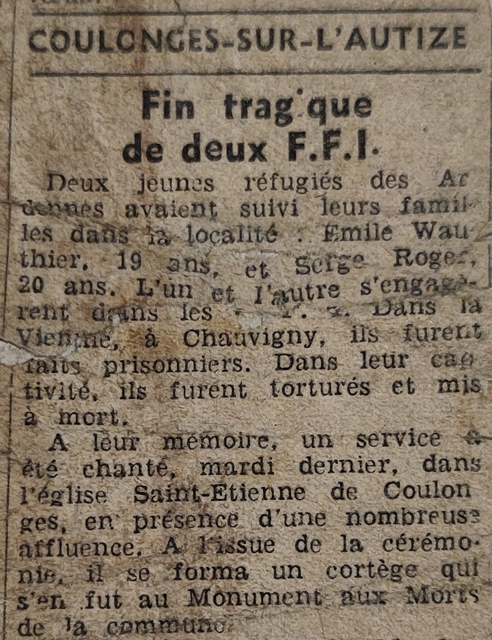 […] Étant des amis très intimes de la famille Wauthier, réfugiés en 40 chez nous à Coulonges, laissant leur fils Émile à Coulonges de peur qu’il parte en Allemagne. Le 31 juillet il partait comme volontaire dans le groupement Le Chouan, et depuis jamais de nouvelles de lui. Des jeunes gens du même groupe, venant en permission à Coulonges, rapportèrent la terrible nouvelle qu’Émile Wauthier et Serge Roger natifs tous deux de Sedan et résidant à Coulonges depuis 1940, étaient morts massacrés à Chauvigny (Vienne) le 5 août 44. Depuis, leurs parents ayant appris cette mauvaise nouvelle, malgré les grandes difficultés de transport, sont venus à Coulonges, et se sont rendus sur les lieux. Ils se sont adressés à l’État-Major de Poitiers et ont trouvé le décès de deux jeunes gens, enterrés à Chauvigny. De là ils se sont rendus à la mairie de Chauvigny. Le maire leur donna une réponse assez favorable. Les parents sont repartis avec un peu d’espoir. Dans l’intervalle, vous avez eu la bonté de répondre au renseignement demandé par M. Besnard, disant qu’ils étaient tous les deux en bonne santé, combattant en Vendée. M. Besnard a transmis cette nouvelle à la famille. Alors voyez d’ici la joie des parents, et depuis jamais rien. Ils attendent toujours des nouvelles leur fils qui jusqu’à maintenant ne sont jamais parvenues.