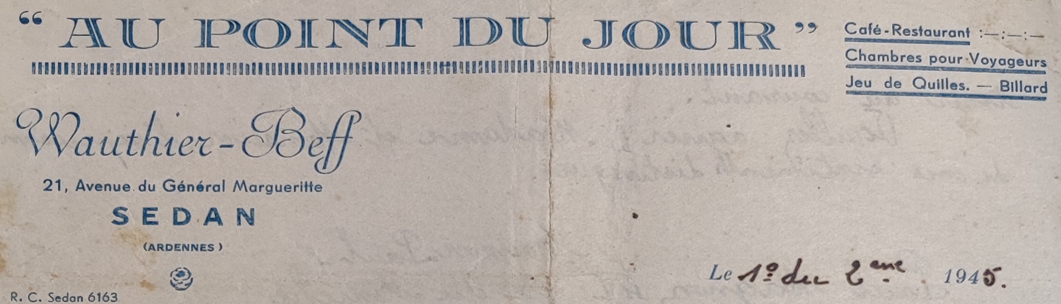 Le numéro 21 de l’avenue du Général Margueritte, à Sedan, n’est pas seulement le lieu de naissance de mon grand-père, il s’agit aussi du lieu de travail de ses parents. C’est même le lieu de mémoire de la famille, puisqu’à cette adresse, on trouve le café-restaurant Au point du jour, comme le montre le papier ci-dessus, édité 20 ans plus tard. Je dispose d’assez peu d’informations sur la jeunesse de mon grand-père à Sedan. Je déduis qu’il est né belge, car de parents belges. Sedan est une commune à l’histoire très riche. Pour des étrangers de si peu de kilomètres, la vie a sans doute dû être paisible, plus paisible que d’autres minorités qui ont trouvé refuge dans cette ville. En effet, je suis toujours admiratif de voir que Sedan, par son statut passé de principauté, ait pu être autant une terre de refuge à travers l’histoire. Dans l’histoire moderne, après la fondation du célèbre Château de Sedan par Evrard II de La Marck au début du XVe siècle, un autre prince de Sedan, Henri-Robert de La Marck, converti au protestantisme, fait de la principauté une terre d’asile. Ce marquage de tolérance permit à l’Académie de Sedan de se constituer, au tournant du XVIIe siècle, sous l’égide du prince Henri de La Tour d’Auvergne. Entre le royaume de France et le Saint-Empire romain germanique, cette petite principauté sedanaise a montré qu’elle était en mesure de constituer une élite culturelle, non seulement en théologie, mais aussi en sciences.