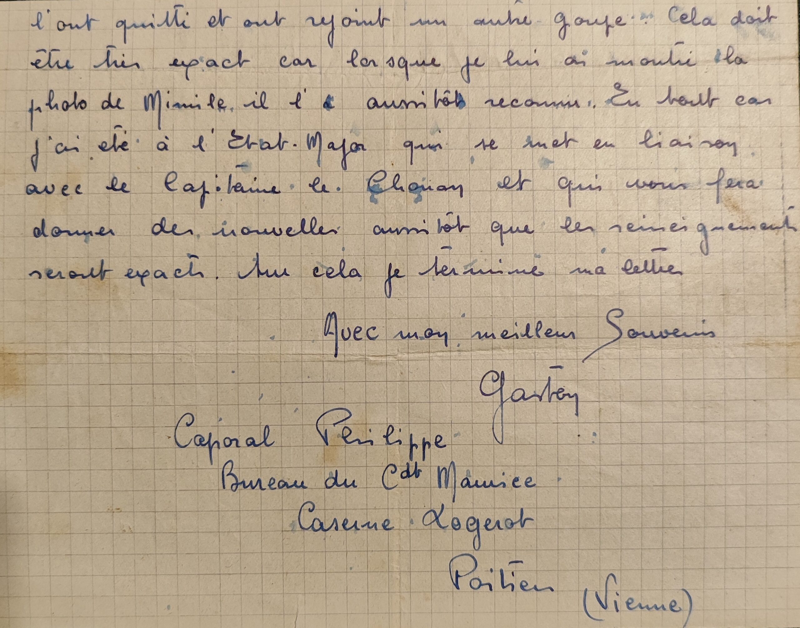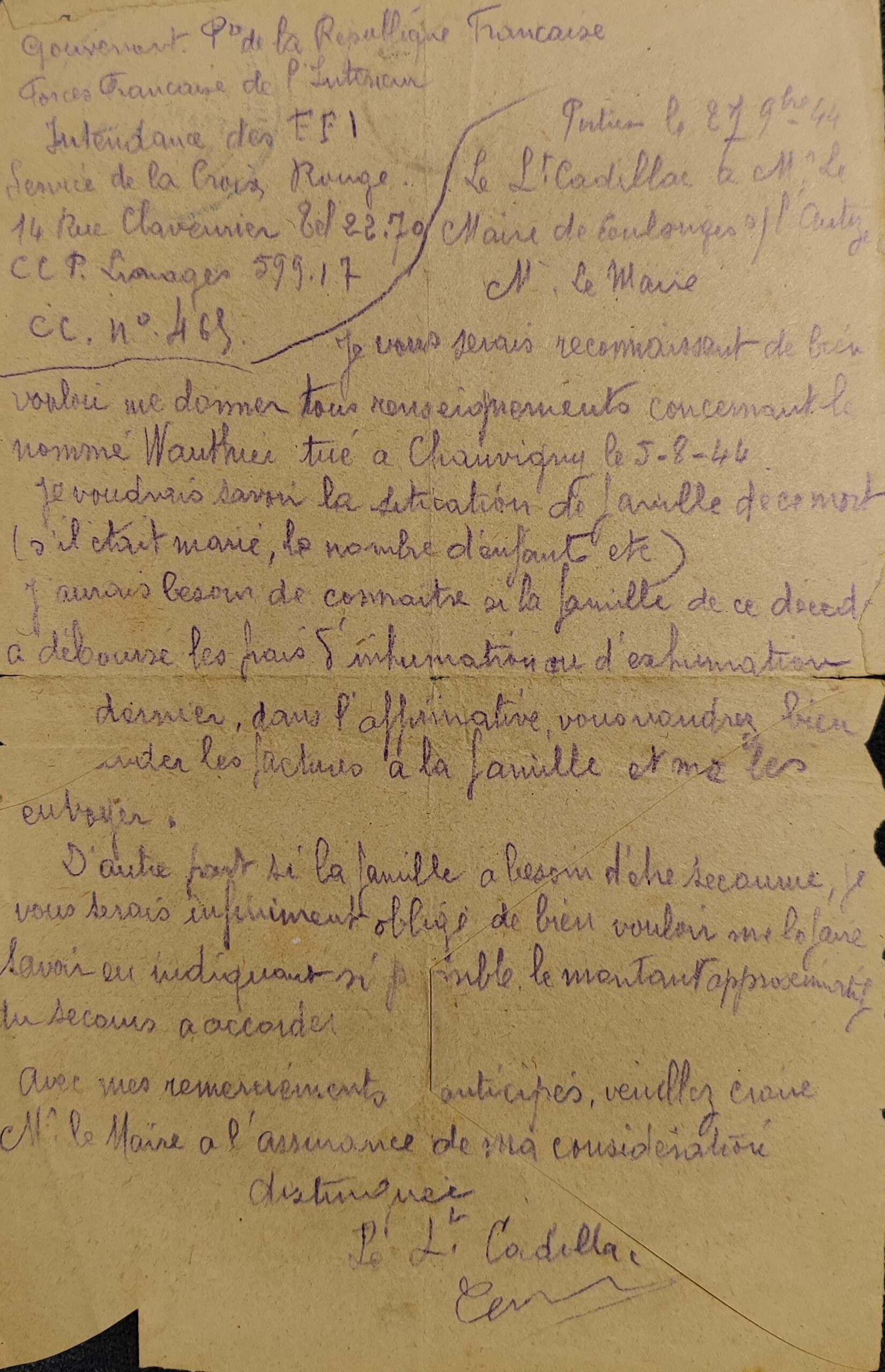 Ce courrier, transcrit par Christian Richard et dont la signature est illisible, confirme qu’Émile Wauthier et son camarade étaient des évacués. Un autre courrier, trouvé dans les archives familiales, maintient cette version, selon laquelle les 2 résistants sont en bonne santé. Il est adressé à Monsieur Bernard et émane de Gaston Philippe, caporal au bureau du commandant Maurice, caserne Logerot, à Poitiers (voir recto et verso). Dans le même temps, j’ai trouvé un courrier rédigé par le Lieutenant Cadillac et adressé au maire de Coulonges le 27 novembre 1944, qui souhaite connaître les circonstances de la mort d’un nommé Wauthier, tué à Chauvigny le 5 août 1944. Cadillac est catégorique, le résistant Wauthier est mort (document original).