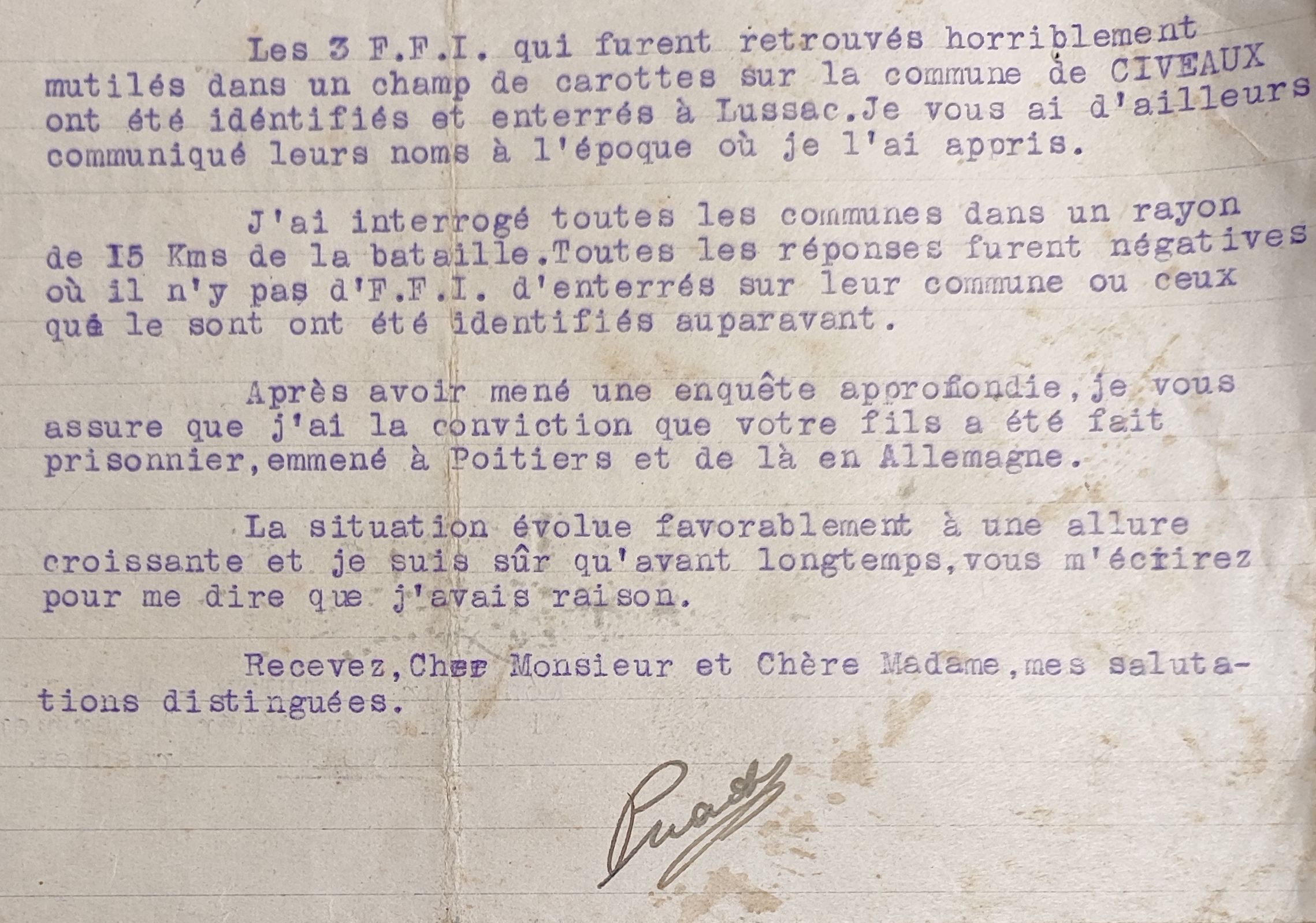 Ces prisonniers furent emmenés a Poitiers, je puis vous affirmer qu’aux environs du 12 au 18 Août, un jeune homme qui s’était évadé d’un train emmenant des prisonniers de Compiègne en direction de l’Allemagne, me déclara, qu’il avait connu dans le camps de Compiègne un nommé Paul Talbot qui avait combattu sous mes ordres. Celui-ci avait déclaré avoir été fait prisonnier a Lussac avec plusieurs camarades, il a pu se rappeler le nombre, avoir été emmené à Poitiers, et de la a Compiègne. Ceci vous donne donc la certitude qu’ils n’ont point été tous fusillés, ni massacrés, mais emprisonnés et déportés en Allemagne comme tant d’autres. Je dis tous, puisque Hélas, j’ai appris que deux cadavres avaient été retrouvés à Chauvigny, je fais le nécessaire pour obtenir le maximum de renseignements sur ces deux cadavres qui n’ont pu être identifiés. […]Lieutenant Ancelin